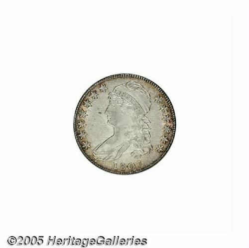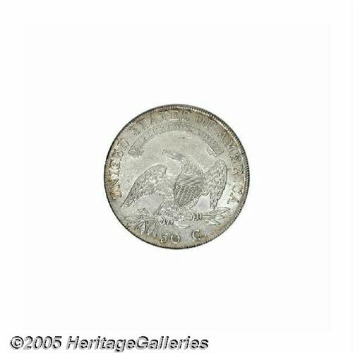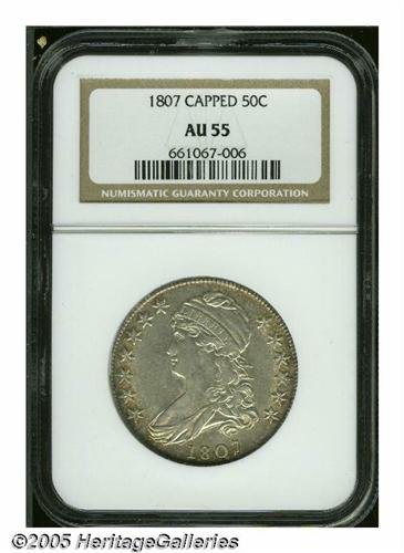 <B>1807<50C> Large Stars, 50 Over 20 AU55 NGC.</B></I> O-112, R.1. The absent-minded die cutter began to enter the denomination as 25C before realizing the mistake and partially effacing the 2. Medium golden-brown toning enriches the peripheries of this lightly circulated early Half Dollar. A few trivial marks near the beak and olive leaves, but quite clean overall. Struck from boldly clashed dies.