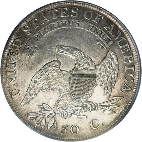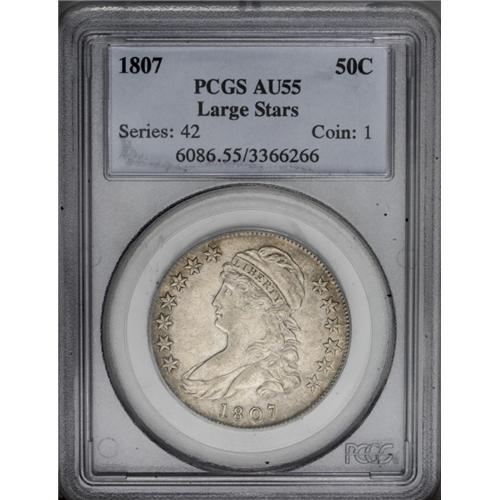 <B>1807<50C> Large Stars, 50 Over 20 AU55 PCGS.</B></I> O-112, R.1. A pleasing example of this well known engraving blunder, with the underdigit 2 clearly visible to the left of the 5 in the denomination. This solid AU representative exhibits abundant luster with hints of golden and violet peripheral toning. <BR><BR><B>Important notice:</B> Heritage usually auctions material at the rate of 200-250 lots per hour. On some occasions eBay Live bid software or the Internet may not be able to keep up with the pace of the auction. We recommend placing a realistic absentee bid now as insurance to avoid disappointment. Occasionally the auctioneer may eliminate or reject an eBay Live bid, and the auctioneer may also reopen a lot after the close of the eBay live bidding (usually because we missed an audience bid), and may reject your bid even if it shows you as the winning bidder. By bidding via eBay Live, you agree that Heritage may award the lot to another bidder at its sole discretion under the circumstances described above or any other reasonable circumstances. Since eBay bids are not shown to us until we open the lot on the floor, we treat those bids just like floor bids. In most cases the floor responds before the eBay bid is presented to us, due to Internet lag time, so for consistency we have made it a policy that floor bids are always considered first over tie eBay live bids. Also please note that all Heritage lots purchased through eBay Live carry a 20% Buyer's Premium. Please make sure you read the Terms and Conditions before you bid. This lot is being auctioned in conjunction with a live floor auction by Heritage Galleries & Auctioneers. All final auction and invoice information will be supplied by Heritage Galleries & Auctioneers, and all other information should be considered preliminary. Lot:1933 <BR><BR><B>Winning Notification and Billing:</B> After the FINAL session in this auction is complete, Heritage will send e-mail and snail mail invoices. This process normally takes several days. All final auction and invoice information will be supplied by Heritage Galleries & Auctioneers, and all other information should be considered preliminary. <BR><BR>This auction will be conducted on a live auction floor and over the Internet through eBay Live. If you choose to place an absentee bid, please take a moment to <font color='#0000ff'><u><a href='http://pages.ebay.com/liveauctions/help/before/laabsentee.html'>learn how eBay Live absentee bidding works</a></u></font><font color='#000000'>