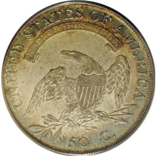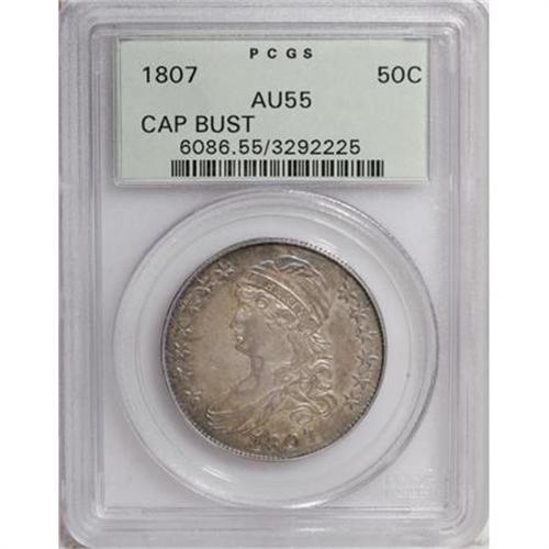 <B>1807 50C Large Stars, 50 Over 20 AU55 PCGS.</B></I> O-112, R.1. The 5 in the denomination is punched over a 2, with the curve of the 2 showing clearly to the upper left of the 5. O-112 has both serifs at the base of the 1 in the date. This is a lovely Choice AU specimen that displays ample luster in the recessed areas, and whose light gray surfaces are accented in cobalt-blue, lavender, and golden-brown around the borders. Excellent design detail adds to the coin's overall eye appeal, as does the fact that the surfaces are quite clean. A solitary mark between star 2 and the chin might serve as a pedigree marker. Housed in a green-label holder. Population: 26 in 55, 38 finer (6/07).<BR><BR><b>Shipping:</b> Coins & Currency (<a target="_blank" href="http://www.heritageauctions.com/common/shipping.php">view shipping information</a>)