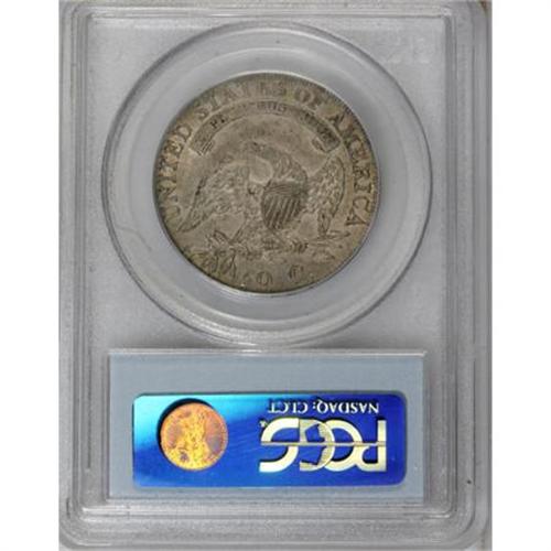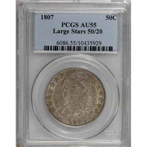 <B>1807 50C Large Stars, 50 Over 20 AU55 PCGS.</B></I> O-112, R.1. A charming first-year Capped Bust half with the engraving blunder 50 Over 20. The diemaker began to enter the denomination as 25C before realizing the mistake. A similar 25 Over 50C error occurs on 1822 and 1828 quarters.<BR>This example is tan-gray with gunmetal toning on the device highpoints. Satin luster shimmers from protected areas. Impressively unabraded despite its light circulation.<BR><BR><B>Coin Engraver:</B> John Reich<BR><BR><b>Shipping:</b> Coins & Currency (<a target="_blank" href="http://www.heritageauctions.com/common/shipping.php">view shipping information</a>)
