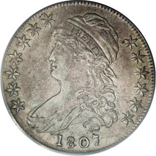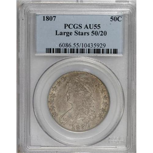 <B>1807 50C Large Stars, 50 Over 20 AU55 PCGS.</B></I> O-112, R.1. A charming first-year Capped Bust half with the engraving blunder 50 Over 20. The die maker began to enter the denomination as 25C before realizing the mistake. A similar 25 Over 50C error occurs on 1822 and 1828 quarters. This example is tan-gray with gunmetal toning on the device highpoints. Satin luster shimmers from protected areas. Impressively unabraded despite its light circulation. <BR><BR><B>Coin Engraver:</B> John Reich<BR><BR><b>Shipping:</b> Coins & Currency (<a target="_blank" href="http://www.heritageauctions.com/common/shipping.php">view shipping information</a>)