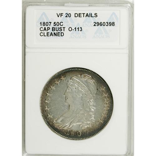 <B>1807 50C Large Stars, 50 Over 20--Cleaned--ANACS. VF20 Details.</B></I> O-113. NGC Census: (73/394). PCGS Population (17/211). Mintage: 750,500. Numismedia Wsl. Price: $225. (#6086)<BR><BR><b>Shipping:</b> Coins & Currency (<a target="_blank" href="http://www.heritageauctions.com/common/shipping.php">view shipping information</a>)