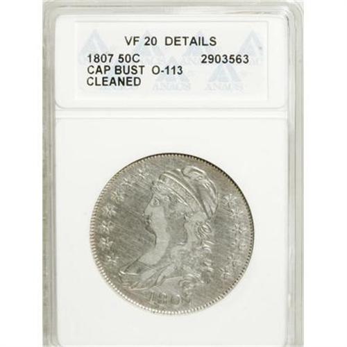<B>1807 50C Cap Bust, Large Stars, 50 Over 20--Cleaned--ANACS. VF20 Details.</B></I> O-113. NGC Census: (12/315). PCGS Population (20/227). Mintage: 750,500. Numismedia Wsl. Price for NGC/PCGS coin in VF20: $400. (#6086)<BR><BR><B>Coin Engraver:</B> John Reich<BR><BR><b>Shipping:</b> Coins & Currency (<a target="_blank" href="http://www.heritageauctions.com/common/shipping.php">view shipping information</a>)