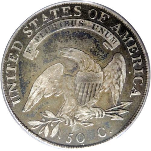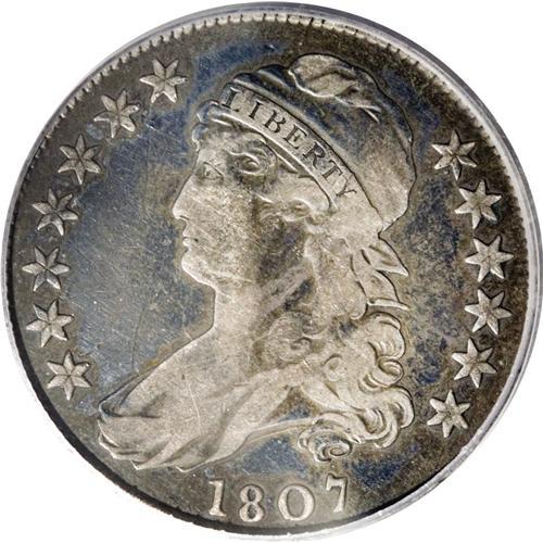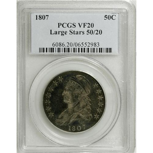 <B>1807 50C Large Stars, 50 Over 20 VF20 PCGS.</B></I> O-111, High R.4 for the variety. This is the famous "Bearded Goddess" variety, but there is no evidence of any obverse cracks, and it ranks R.7 in this die state. Steve Herrman suggests that only five similar pieces are known. This glossy example has dark forest-green toning and a couple of moderate obverse marks.<BR><BR><b>Shipping:</b> Coins & Currency (<a target="_blank" href="http://www.heritageauctions.com/common/shipping.php">view shipping information</a>)