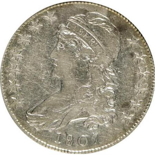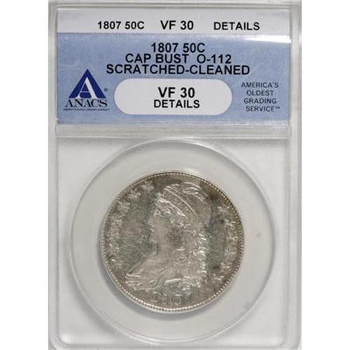 <B>1807 50C Cap Bust, Large Stars, 50 Over 20--Cleaned, Scratched--ANACS. VF30 Details.</B></I> O-112. NGC Census: (27/277). PCGS Population (19/186). Mintage: 750,500. Numismedia Wsl. Price for NGC/PCGS coin in VF30: $580. (#6086)<BR><BR><B>Coin Engraver:</B> John Reich<BR><BR><b>Shipping:</b> Coins & Currency (<a target="_blank" href="http://www.heritageauctions.com/common/shipping.php">view shipping information</a>)