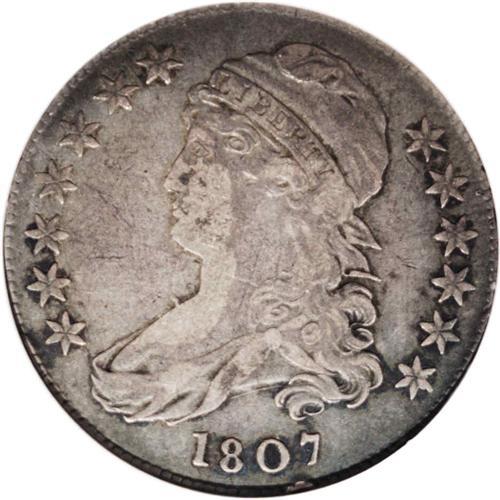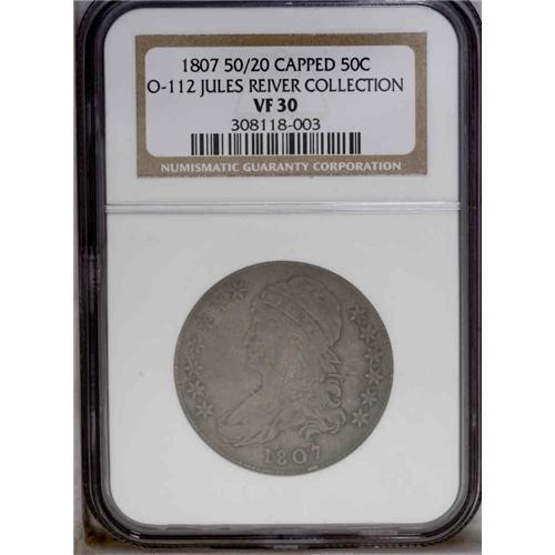 <B>1807<50C> Large Stars, 50 Over 20 VF30 NGC.</B></I> O-112, R.1. Always popular with both Bust Half variety collectors as well as <I>Guide Book</B></I> major variety collectors, this blundered die was created when the die sinker punched a 2 in error, rather than a 5, for the denomination before "correcting" the problem. This specimen has dusky gray toning with hints of bronze peeking through. Some die clash marks are evident on the obverse, and perusal with a glass reveals a few old scrapes.<BR><I>Ex: Don Frederick (3/17/1980).</B></I> Envelope Included.