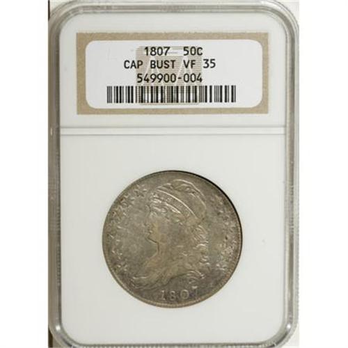 <B>1807 50C Large Stars, 50 Over 20 VF35 NGC.</B></I> O-112, R.1. The distinctive "overdenomination" variety, a striking curiosity from the Mint's early years. Though Choice VF by its luminous, gold-toned surfaces, the portrait shows little detail and the reverse displays a pair of significant marks near the denomination.<BR><BR><B>Coin Engraver:</B> John Reich<BR><BR><b>Shipping:</b> Coins & Currency (<a target="_blank" href="http://www.heritageauctions.com/common/shipping.php">view shipping information</a>)