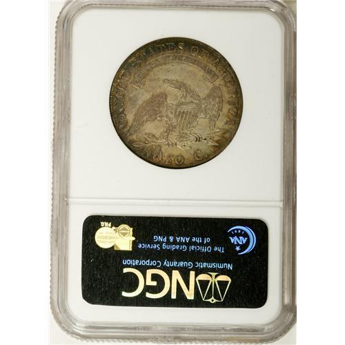 <B>1807 50C Large Stars, 50 Over 20 XF40 NGC.</B></I> O-112, R.1. Rich powder-blue and aquamarine blushes embrace this partly lustrous and somewhat granular Bust half. The popular <I>Guide Book</B></I> blundered die variety, caused when the engraver began to enter the denomination as 25 C.<BR><BR><b>Shipping:</b> Coins & Currency (<a target="_blank" href="http://www.heritageauctions.com/common/shipping.php">view shipping information</a>)