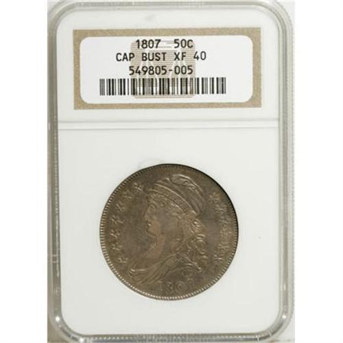 <B>1807 50C Capped Bust, Small Stars XF40 NGC.</B></I> O-113, R.2. Intermediate die state, with the lengthy die crack on the left side of the reverse almost complete. Although not particularly well struck, the surfaces are nearly mark-free and retain a hint of luster beneath antique-golden and steel-blue toning.<BR><BR><B>Coin Engraver:</B> John Reich<BR><BR><b>Shipping:</b> Coins & Currency (<a target="_blank" href="http://www.heritageauctions.com/common/shipping.php">view shipping information</a>)