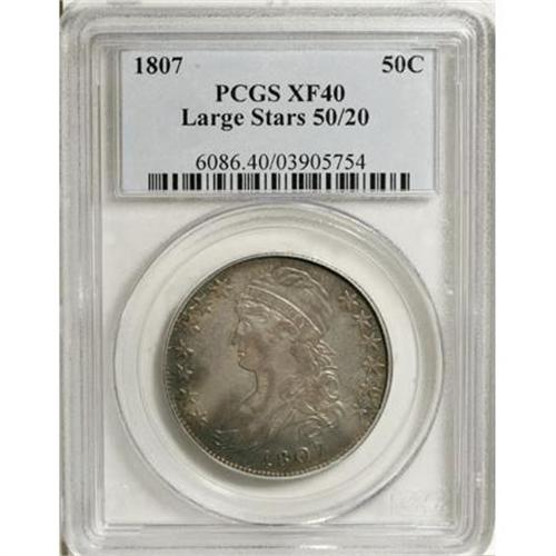 <B>1807 50C Large Stars, 50 Over 20 XF40 PCGS.</B></I> O-112, R.1. This variety shares a common reverse with O-111. Per Overton (Third Edition): "The 5 in 50 C was first punched using a 2. This punching error was corrected by punching a 5 over the 2. The 2 shows clearly underneath." This richly toned specimen is evenly worn, with few marks on either side. <BR><BR><BR><B>Coin Engraver:</B> John Reich<BR><BR><b>Shipping:</b> Coins & Currency (<a target="_blank" href="http://www.heritageauctions.com/common/shipping.php">view shipping information</a>)