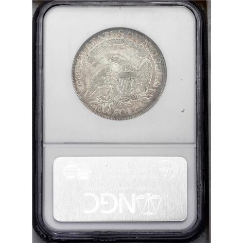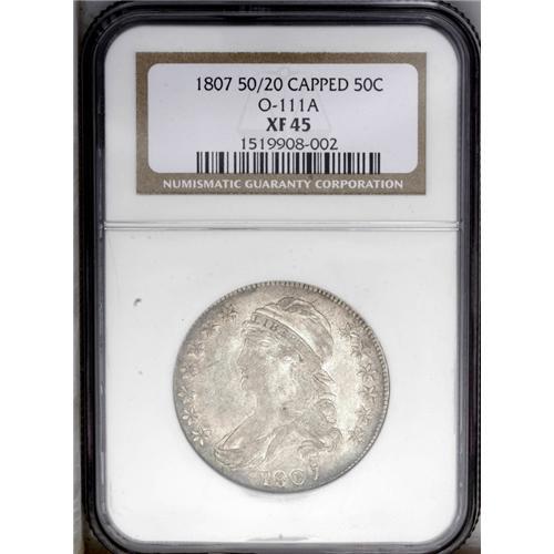 <B>1807<50C> Large Stars, 50 Over 20 XF45 NGC.</B></I> O-111a, R.5. An early die state of the famous 'Bearded Goddess' variety. Pleasingly original toning covers both sides of this evenly worn, still-lustrous example. The remnant of a 2 near the 5 in the denomination is easily visible under a glass. An absent-minded engraver thought that he was working on a quarter dollar die, then realized his mistake. <BR><BR><B>Important notice:</B> Heritage usually auctions material at the rate of 200-250 lots per hour. On some occasions eBay Live bid software or the Internet may not be able to keep up with the pace of the auction. We recommend placing a realistic absentee bid now as insurance to avoid disappointment. Occasionally the auctioneer may eliminate or reject an eBay Live bid, and the auctioneer may also reopen a lot after the close of the eBay live bidding (usually because we missed an audience bid), and may reject your bid even if it shows you as the winning bidder. By bidding via eBay Live, you agree that Heritage may award the lot to another bidder at its sole discretion under the circumstances described above or any other reasonable circumstances. Since eBay bids are not shown to us until we open the lot on the floor, we treat those bids just like floor bids. In most cases the floor responds before the eBay bid is presented to us, due to Internet lag time, so for consistency we have made it a policy that floor bids are always considered first over tie eBay live bids. Also please note that all Heritage lots purchased through eBay Live carry a 20% Buyer's Premium. Please make sure you read the Terms and Conditions before you bid. This lot is being auctioned in conjunction with a live floor auction by Heritage Galleries & Auctioneers. All final auction and invoice information will be supplied by Heritage Galleries & Auctioneers, and all other information should be considered preliminary. Lot:1932 <BR><BR><B>Winning Notification and Billing:</B> After the FINAL session in this auction is complete, Heritage will send e-mail and snail mail invoices. This process normally takes several days. All final auction and invoice information will be supplied by Heritage Galleries & Auctioneers, and all other information should be considered preliminary. <BR><BR>This auction will be conducted on a live auction floor and over the Internet through eBay Live. If you choose to place an absentee bid, please take a moment to <font color='#0000ff'><u><a href='http://pages.ebay.com/liveauctions/help/before/laabsentee.html'>learn how eBay Live absentee bidding works</a></u></font><font color='#000000'>