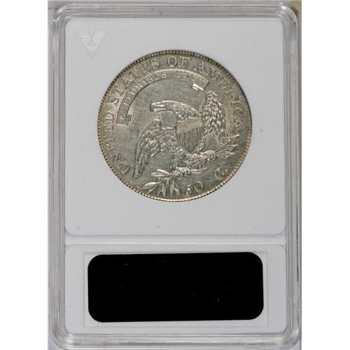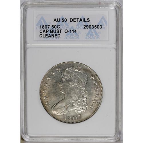 <B>1807<50C> Capped Bust, Large Stars--Cleaned--ANACS. AU50 Details.</B></I> O-114, R.3. A lightly worn and well struck piece with pale red accents at the periphery. The hairlined surfaces have faint echoes of their original luster.
