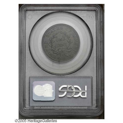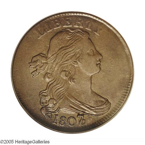 <B>1807/6<1C> Large 7 AU58 PCGS.</B></I> S-273, R.1. A popular variety due to its pronounced underdigit. This glossy brown representative is well defined save for localized flatness on RTY of LIBERTY and the corresponding area of the reverse. Characteristic die clashing is easily recognized about the portrait. The die elements are well centered on the planchet. A few minute ticks are scattered about, especially in the right obverse field, but none are individually serious. An overall pleasing Draped Bust Large Cent. Population: 2 in 58, 2 finer (10/05).