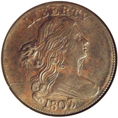 <B>1807/6 1C Large 7 MS62 Brown NGC.</B></I> S-273, Die State IV, R.1. Medium to dark brown surfaces with much underlying glossiness on the obverse. A hint of swelling behind Liberty's lower curls and a thin rim break on the corresponding area of the reverse, roughly above the STA of STATES, identifies this more plentiful die state. The Large 7 overdate from this year has always been a popular issue because almost no effort was made to efface the underdigit. Easily located in circulated grades, only at the Mint State level does the 1807/6 Large 7 cent become difficult to obtain. EAC 50. Census: 5 in 62, 1 finer (1/06).
