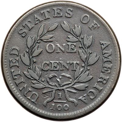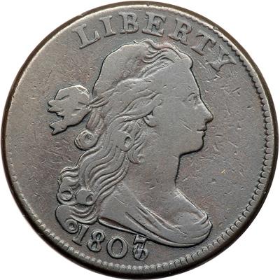 1807/6 S-272 R4+ Small Overdate 7 over 6. VG-10. Choice glossy medium brown and chocolate. The surfaces are smooth and the planchet is completely free of corrosion or verdigris. Only trivial contact marks, none notable. The best identifying mark is a small, faint spot of reddish brown toning at the hair under the upright of the R in LIBERTY. EDS, Breen state I. Both dies are unclashed and uncracked. The date and overdate are bold, and the legends are strong. A premium example of this rare and very popular "Redbook" variety, one of Dr. Sheldon’s "Famous Four." Called VG10 by Noyes and Bland. Bland has this one tied for CC#10 while Noyes says this one is choice for the grade and tied for CC#7, his photo #26626. Removed from an NGC slab graded VF25 (NGC label included, and it shows the attribution and Reiver provenance). NGC Population 1; The finest graded at NGC for the variety. DWH #2891.