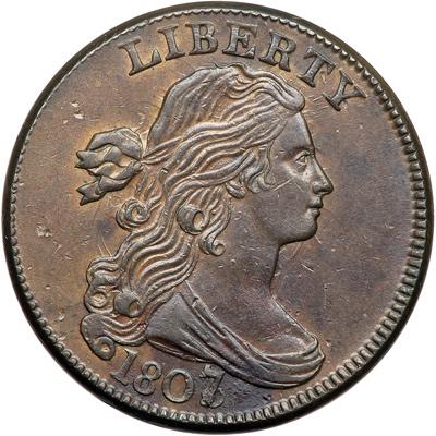 1807/6 S-273 R1 Large Overdate 7 over 6. EF-45. Five points sharper with a splash of very light roughness in a reddish olive stain on the 7 in the date extending to under the bust tip. The remainder of the planchet is smooth and very attractive. There are a few small, light contact marks on each side, including a dull nick in the field left of the middle curls and a dull, light nick on the lower half of the O in OF. Glossy chocolate brown with lots of frosty tan and light brown toning in protected areas and a small area of reddish chocolate toning at the dentils over ST in STATES. Nicely struck E-MDS, Breen state II. There are die clashmarks on both sides of the portrait and several short die lines have been added at IC in AMERICA. DWH #3207.