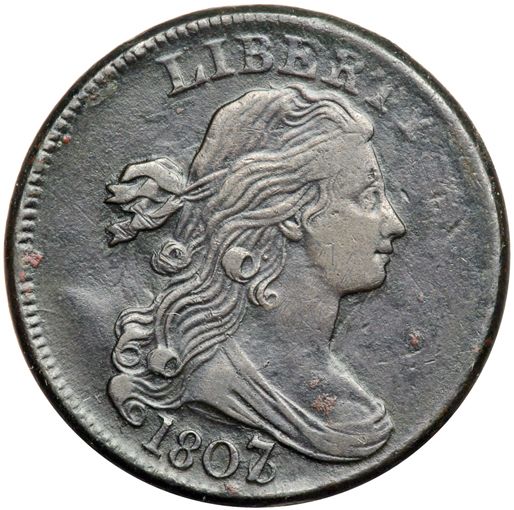 1807/6 S-273 R1 Overdate Large 7 over 6 VF20. Sharpness VF35 but there are a half dozen small spots of raised reddish brown verdigris, mostly on the obverse. The notable ones are on the bust and at the dentils left of the neck. Rather glossy dark olive brown. There is shallow dirt or verdigris caked into protected areas on the reverse and the dark patina suggests the planchet is not perfectly smooth under the toning. Nonetheless, the eye appeal is decent and the overdate is bold. LDS, Breen state IV, showing obvious swelling in the field left of the lowest curl and a narrow rim cud break at ST in STATES (this rim cud extends to the adjacent A in the latest state).