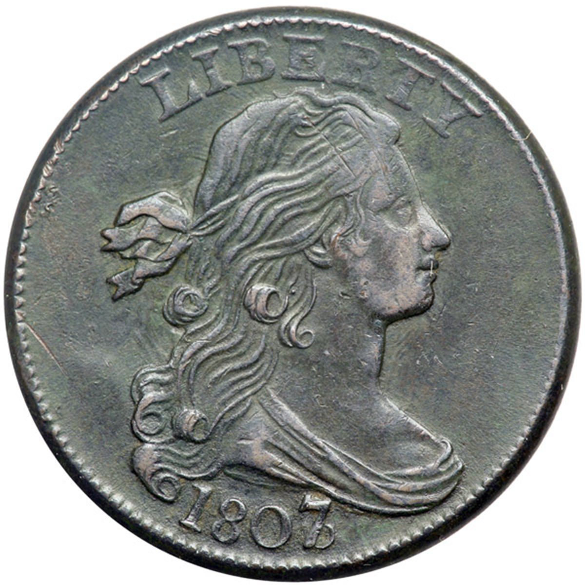 1807/6 S-273 R1 Overdate Large 7 over 6 VF25. Sharpness EF45 with a dusting of dark greenish olive verdigris in the protected areas on both sides. Much of the crud may be removable dirt. No apparent corrosion, just a few contact marks. The notable ones are a short scratch near the rim left of the middle curls and a couple more faint ones in the hair under ER in LIBERTY. Rather frosty dark olive and steel with a bit of natural gloss in the mix. MDS with subtle swelling in the field left of the lower curls. This one may benefit from a proper bath.