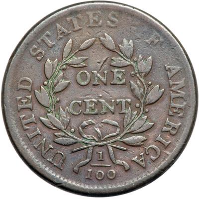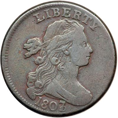1807/6 S-273 R1. VG-10. Large Overdate 7 over 6. Slightly sharper with fine hairline scratches on the portrait and a dull nick over the N in ONE. Mostly glossy chocolate and reddish steel brown. Traces of greenish crud are caked into protected areas around the wreath. E-MDS. The obverse is slightly misaligned to K-3 while the reverse is properly centered on the planchet. The date and legends are strong and the overdate is obvious.