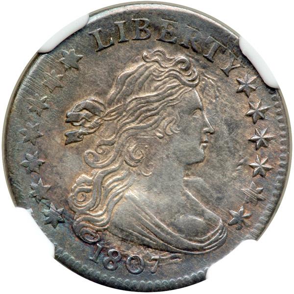 1807. JR-1. NGC graded MS-61. Well struck in the centers with some weakness from crumbling dies around the borders. We also note die clashing on the obverse and some faint adjustment marks about the rims. All nicely toned with electric blue borders and light gold toning.