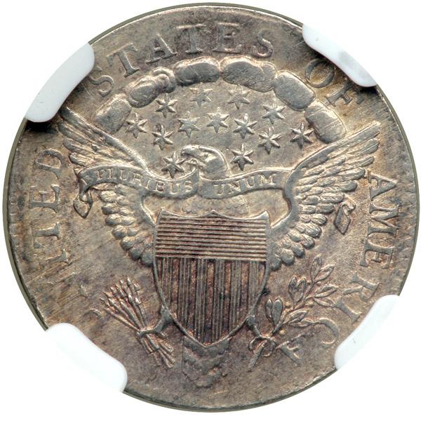 In 1798, designer Robert Scot replaced the small eagle with the scaled down version of the Great Seal of the United States that was first seen on the gold quarter eagle of 1796. This depicted a heraldic eagle with the Union Shield on its breast and a ribbon inscribed E PLURIBUS UNUM in its beak. Judging from the lack of negative comment, this new Draped Bust/Heraldic Eagle combination obviously came closer than the previous design to satisfying the objections of critics.