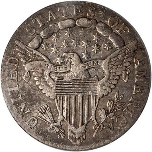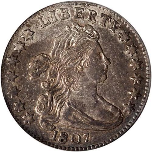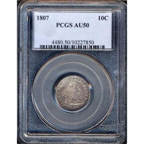 <b>1807 Draped Bust Dime. PCGS graded AU50.</b> A lustrous though unevenly struck dime with toning that shades from silvery to natural medium gray. The reverse has full sharp detail on the eagle plus clear UNITED STATES OF AMERICA around, a definite advantage over the usual weak strikes. Go for it while the opportunity permits <b>(PCGS # 4480)</b> <i>