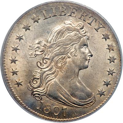 Holding a Draped Bust quarter in your hand brings to mind an era when the Ohio Valley was a distant land with trappers and Indians dominating the landscape west of the Appalachians; Jefferson had only recently completed the Louisiana Purchase which brought Emperor Napoleon (the seller) much needed gold to fight his endless wars back home. Somehow, through wars and inflation and the fickle finger of Fate, this lovely Mint State 1807 has come down to us, virtually as struck, a bright fresh reminder of days of yore. It will not be forgotten by today's loving collector.