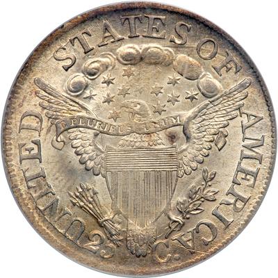 Of historical interest: In large measure the early public indifference to this now-essential denomination was attributable to the fact that Americans didn't need it at that time. The Spanish two-reales piece, which circulated widely in the post-revolution United States, had exactly the same purchasing power -- 25 cents. Then as now, people tended to favor things (including coins) with which they were most familiar. Under the circumstances, there was no particular urgency to strike quarter dollars at all, as evidenced by the fact that from 1796 to 1814, a period of nearly 20 years, the Mint produced quarters for only five dates and in quantities totaling barely half a million pieces. Indeed, the trivial output seems to have been intended primarily to establish the denomination's existence -- just to show the flag, so to speak.