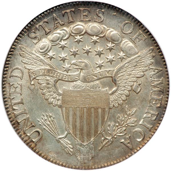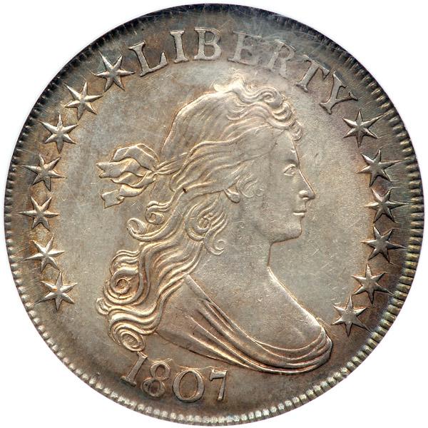1807 Draped Bust Half Dollar. . Overton-105, Rarity-1. NGC graded MS-62. Light blue and gold toning. A lustrous, well struck exmaple of the popular Large Eagle (or Heraldic Eagle) Type, in production for only a few years from 1801-07. This die marriages pairs Obverse 4 of 1807 (1 jointed to curl) with reverse C having the beak and star joined point to point with a visible small lump from a chip in the die near the milling between S of STATES and O of OF. A die crack joins STATES OF at top. Condition Census (65,64,62,58, 55). Pop 10; 52 finer.