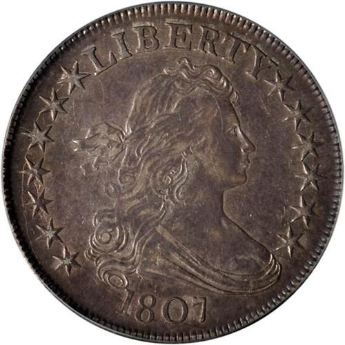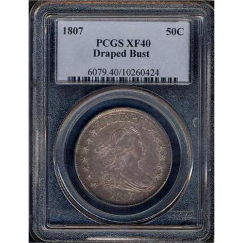 <b>1807 Draped Bust Half Dollar. PCGS graded EF40.</b> Extremely bold relief on both sides, with gorgeous original toning. It is plain to us the consignor waited until just the right coin came along to fill the requirements for the draped bust, heraldic eagle date of 1807. But bidders shouldn't wait for another to bid or the opportunity will be gone <b>(PCGS # 6079)</b> <i>