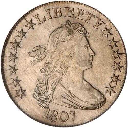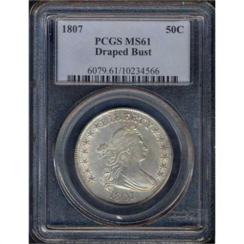 <b>1807 Draped Bust Half Dollar. PCGS graded MS61.</b> Sleek silvery gray surfaces exhibit original cartwheel spin and a satin, almost delicate quality that really engages the aesthetic sense with its serene beauty. The centers are sharper than average for this year, as well, comparing favorably with an even higher grade than the MS61 assigned to it by PCGS.