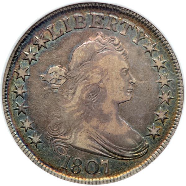 1807. ANACS graded VF-20. Attractive antique toning of blue and gold, final year in which the mint struck the draped bust, large (or heraldic) eagle combo. A capped, draped bust of the nation's chief allegorial representation appears henceforth, from 1807 to 1836.