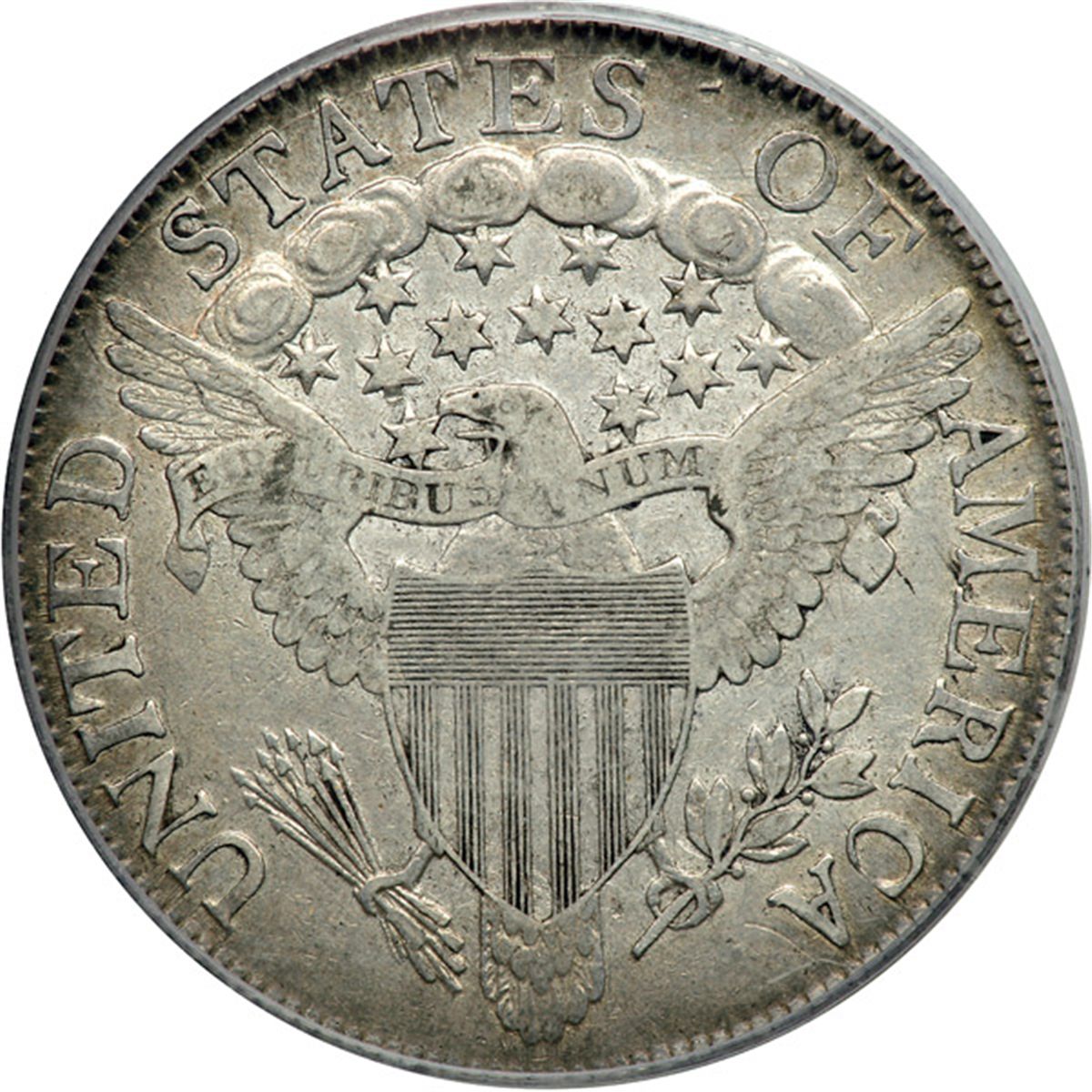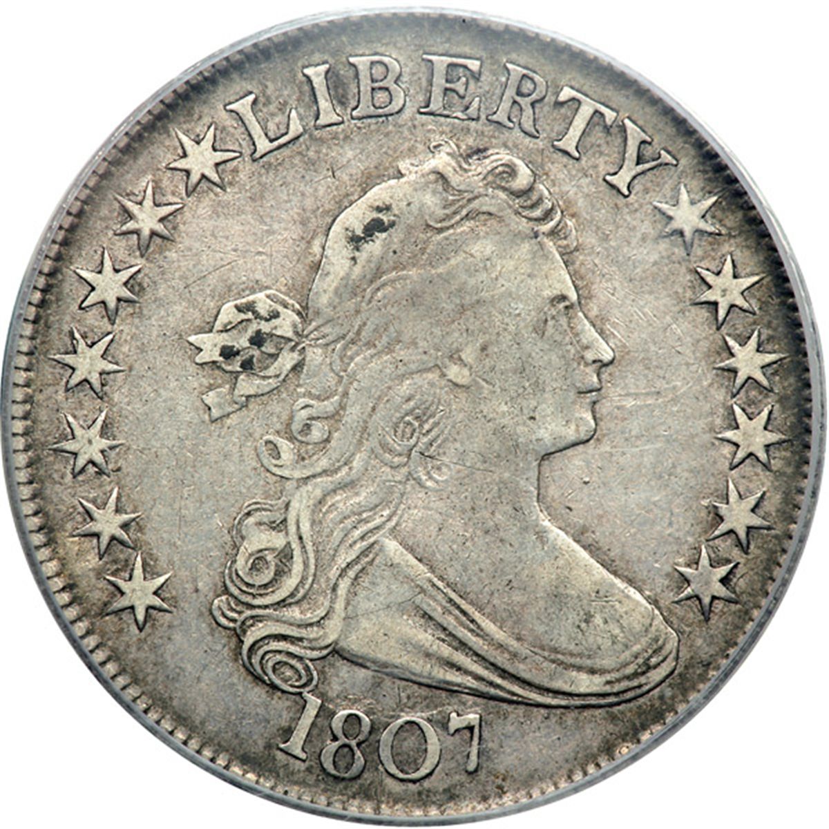 1807 Draped Bust Half Dollar. . O-105, Rarity-1. PCGS graded EF-40. Lightly toned with pleasing pale gray shades, deeper in the recesses, most evident within the shield stripes and chief. Well centered and a problem-free planchet. An excellent choice for the numismatist to represent the Drapest Bust right, Heraldic Eagle style. 1807 is the last year this Type was minted (PCGS # 6079) .