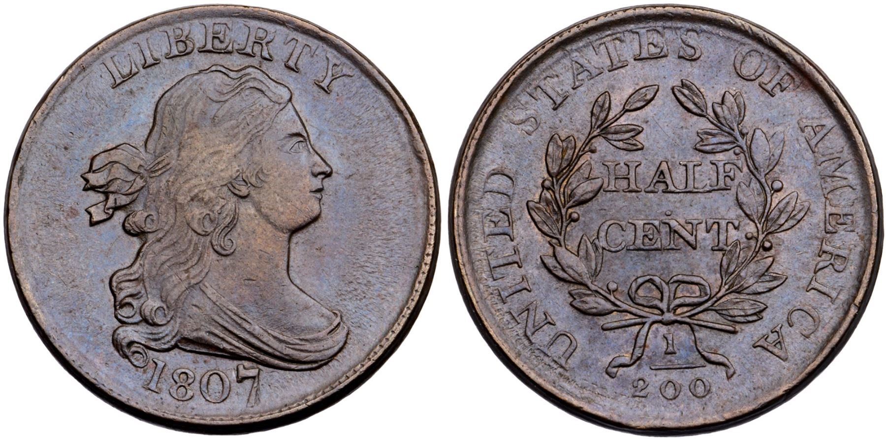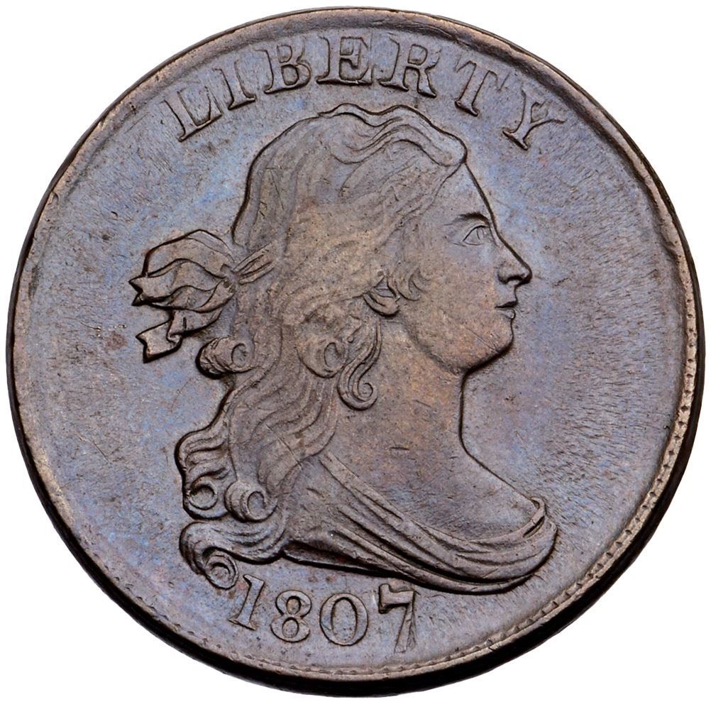 1807 C-1 R-1 AU50Attractive deep brown with bluish steel tones on frosty surfaces. Free of notable marks or distractions. Choice with nice eye appeal. LDS, Manley state 3.0. Removed from a PCGS AU 53 holder (1104.53/5746351).Certificate Number: Pedigree: Ex; Tom Reynolds 6/11/2003 - Bob Kebler Collection