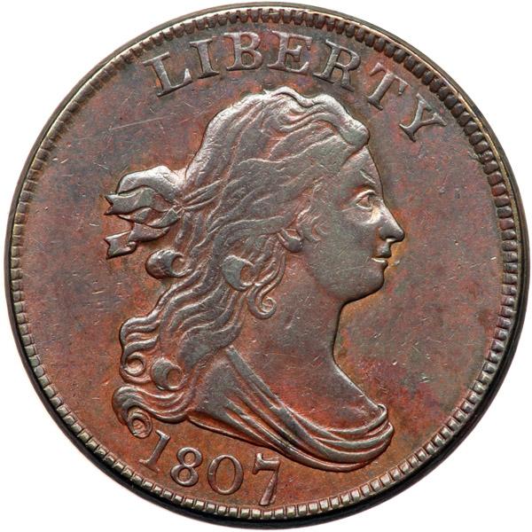 1807 C-1 R1 EF40. Glossy dark steel brown with reddish brown toning in protected areas. A tiny nick on the eyebrow, another in the middle of the neck, and a shallow low spot under the first T in STATES (as struck) are the only marks worthy of any mention. Extremely rare earliest die state, Manley state 1.0 early, with fine die clashmarks on the obverse and sharp dentils all the way around the obverse. There are strong die polishing lines in the field down from the chin and others connecting the bust to the dentils below. (Breen noted in his discussion of die state II that an example with obverse die clashmarks and strong dentils was unknown, but that one probably existed. This piece proves he was correct. See the Breen half cent encyclopedia, page 278.) The reverse is rotated 10 degrees CCW. Plated in the second edition of the Cohen book to illustrate the early die state (page 65). Davy #07.1.31.