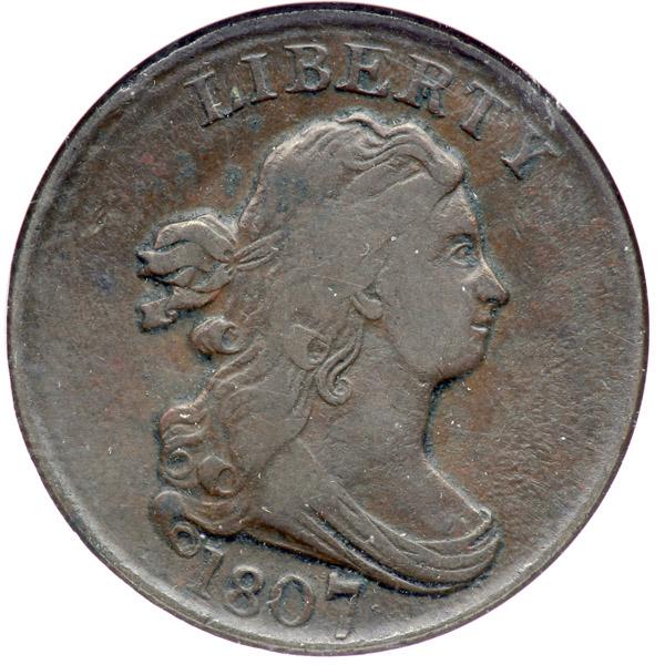 1807 C-1 R1. NGC graded VF-30. Glossy olive brown and chocolate. Traces of frosty flowline luster can be found in some of the protected areas, especially on the reverse. An attractive piece for the grade with only trivial marks. A few very fine hairline scratches at NT in CENT are the only notable defects, and they are barely visible with a good glass. M-LDS. Our grade is VF25.