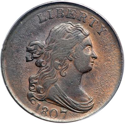 1807 C-1 R1. PCGS graded AU-55. Choice frosty tan and light brown with darker steel brown and chocolate toning covering the devices and a couple hints of very faded mint color in protected areas. Satiny mint luster covers the surfaces and this piece offers outstanding eye appeal. Just a hint of friction on the highest points of the obverse from mint state. LDS, Manley state 3.0, with a fine die crack through the tops of 07 to the bust and the top of STAT weak from die wear. Our grade is AU55 choice.
