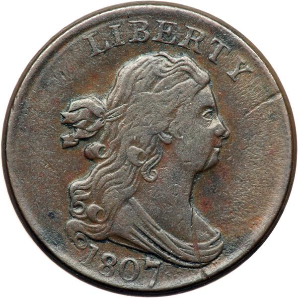 1807 C-1 R1 VF35. Double Struck. Five points sharper but there are some very faint hairline scratches at D-STA, all hidden in the attractive glossy chocolate brown toning. Both sides have a few small splashes of darker olive brown toning in the mix. Underlying frosty flowline luster covers the fields and protected areas on both sides. This piece was struck two times. One strike was normal and centered on the planchet. The other strike was against a blank planchet positioned 65% off center against the obverse. The sequence of strikes is speculative. Since there is no trace of doubling from die strikes on either side, it would appear the impressed arc came first. But this is only a guess. What is certain is that this piece is very attractive and the indented arc is obvious. LDS, Manley state 3.0. Davy #07.1.29.