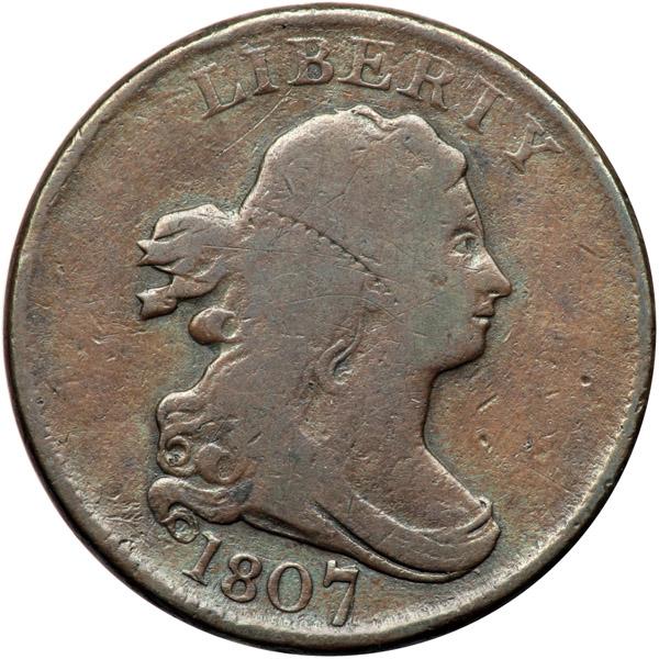 1807 C-1 R1 VG7. Double Struck. Perhaps slightly sharper, especially on the reverse, but there is a small and relatively deep dig at the top of the N in CENT. Otherwise the planchet is smooth and void of any significant marks. Glossy steel brown and chocolate, possibly lightly cleaned and retoned but still attractive for the grade. MDS, Manley state 2.0. Double struck. One strike was normal and centered on the planchet but there was a second strike 40% off center in the form of an arc of dentils across the hair right of the ribbon. It is possible, perhaps probable, that the arc came first and the planchet then was reinserted into the press for a proper strike. There is no evidence of a double strike on the reverse. Not the most impressive version of a double strike, but the evidence is clear to the unaided eye. Davy #07.1.26.