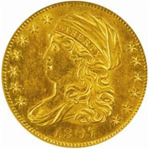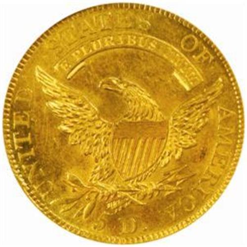 <style type="text/css"> body, td, th { font-family: Arial, Helvetica, sans-serif; font-size: 12px; color: #482424; margin: 0px; padding: 0px; } #header { background-image: url(http://www.bowersandmerena.com/ebay/images/template_v3_01.gif); clear: both; background-color: #590303; border-top-width: 2px; border-top-style: solid; border-top-color: #B38C4F;}#header #header_wrapper { height: 75px; clear: both; width: 800px; margin-right: auto; margin-left: auto; background-image: url(http://www.bowersandmerena.com/ebay/images/template_v3_03.gif); background-repeat: no-repeat; background-position: right; color: #F3EDCC;}#header #header_wrapper #header_logo { float: left; height: 75px; width: 444px; background-image: url(http://www.bowersandmerena.com/ebay/images/template_v3_02.gif); background-repeat: no-repeat; font-size: 10px; text-transform: capitalize; color: #B38C4F;}#header #header_wrapper #header_right { float: left; height: 75px; width: 356px; text-align: right;}#header #header_wrapper #header_right #headerLoginBtn { margin-bottom: 30px;}#header #header_wrapper #header_right input#txtSearch { color: #B49056; border: 1px solid #B49056; width: 175px; padding-top: 3px; padding-right: 3px; padding-bottom: 4px; padding-left: 3px;}#nav { height: 37px; background-image: url(http://www.bowersandmerena.com/ebay/images/template_v3_05.gif); clear: both;}#nav #nav_wrapper { height: 35px; width: 800px; margin-right: auto; margin-left: auto; border-left-width: 1px; border-left-style: solid; border-left-color: #B38C4F;}#nav #nav_wrapper a { padding-right: 15px; padding-left: 15px; border-right-width: 1px; border-right-style: solid; border-right-color: #B38C4F; height: 25px; padding-top: 10px; display: block; float: left; text-decoration: none; font-weight: bold; color: #5D0303;}#nav #nav_wrapper a:hover { color: #B38C4F;}#nav #nav_wrapper #search { float: right; padding-top: 7px;}#nav #nav_wrapper #search #txtSearch { font-family: Arial, Helvetica, sans-serif; font-size: 10px; text-transform: uppercase; color: #D2AE75; border: 1px solid #B38C4F; padding: 3px;}#content_bgd { background-image: url(http://www.bowersandmerena.com/ebay/images/template_v3_09.gif); background-repeat: repeat-y; background-position: center; padding-top: 15px; padding-bottom: 15px; background-color: #FBFBDB;}#content_wrapper { clear: both; height: auto; width: 800px; margin-right: auto; margin-left: auto;}.LotDetailWhite{ line-height:normal; font-size:13px; font-family: arial,helvetica,sans-serif; color: White; font-weight: bold;}.LotDetailInformation{ line-height:normal; font-size: 13px; font-family: arial,helvetica,sans-serif;}.LotDetailMessage{ line-height:normal; font-size: 13px; font-family: arial,helvetica,sans-serif; color: red;}}tr.HeaderAuctionTitle td { color: #000000; font-weight: bold; padding: 2px; background-image: url(http://www.bowersandmerena.com/ebay/images/template_v3_05.gif); background-repeat: repeat-x; border-bottom-width: 1px; border-bottom-style: solid; border-bottom-color: #B38C4F;}table.AuctionSummary a, table.AuctionSummary a:link, table.AuctionSummary a:visited { color: #0000FF; text-decoration: none;}}td.tableHeaderLeft { border-left-width: 1px; border-left-style: solid; border-left-color: #B38C4F;}td.tableHeaderRight { border-right-width: 1px; border-right-style: solid; border-right-color: #B38C4F;}td.tableCellMiddle { border-left-width: 1px; border-left-style: solid; border-left-color: #B38C4F; border-right-width: 1px; border-right-style: solid; border-right-color: #B38C4F; padding: 5px;}tr.footer td { border-top-width: 1px; border-top-style: solid; border-top-color: #B38C4F;}</style></head><body><div id="header"> <div id="header_wrapper"> <div id="header_logo"> </div> <div id="header_right"> </div> </div></div><div id="nav"> <div id="nav_wrapper"> <a href="http://www.bowersandmerena.com">Our eBayLive Auctions</a> <a href="#PaymentInfo">Payment Information</a> <a href="#ShippingInfo">Shipping Information</a> <a href="#About">About Bowers and Merena</a> </div></div><div id="content_bgd"> <div id="content_wrapper"> <table width="100%" border="0" cellpadding="5" cellspacing="0" class="AuctionSummary"> <tbody> <tr class="HeaderAuctionTitle" style="height: 25px;"> <td align="left" class="tableHeaderLeft" > </td> <td align="center" class="tableHeaderRight"> <span style="font-size: large;">Lot #1100. 1807 Capped Bust Left Half Eagle. BD-8, HBCC-3109, Miller-109. Rarity-2. MS-61 (NGC).</span> </td> </tr> <tr> <td colspan="3" class="tableCellMiddle"> Sharply struck with intricate definition to all design elements, this coin is a lovely representative of the premier issue in the Capped Bust Left $5 series of 1807-1812. Both sides possess suitably vibrant, satin-textured luster that, at direct angles, does reveal modest hints of semi reflectivity in the fields. The dominant color is a rich shade of orange-gold, but we do note even deeper khaki-gold undertones as the coin turns away from a light. Scattered abrasions are commensurate with the grade, and we stress that none are either sizeable or otherwise worthy of singular attention. Really a lovely BU, this piece would make an impressive addition to any collection.