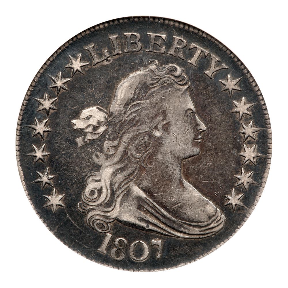 1807 Draped Bust. ANACS graded EF-40. Antique mottled toning, particularly on the reverse. The surfaces are pleasing with good definition on Libertys hair as well as the eagle on the reverse. Our grade VF-30. Estimated Value 900 - 1,000
