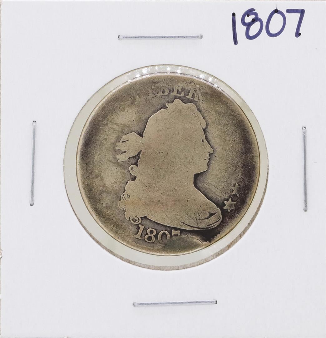 One 1807 Draped Bust Quarter Heraldic Eagle Coin.