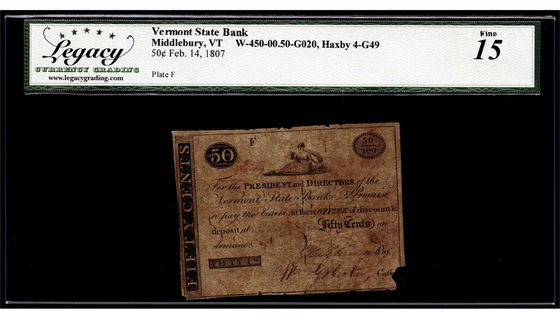 One 1807 Fifty Cents Vermont State Bank Middlebury, VT Obsolete Note Legacy Fine 15. Legacy Graded.