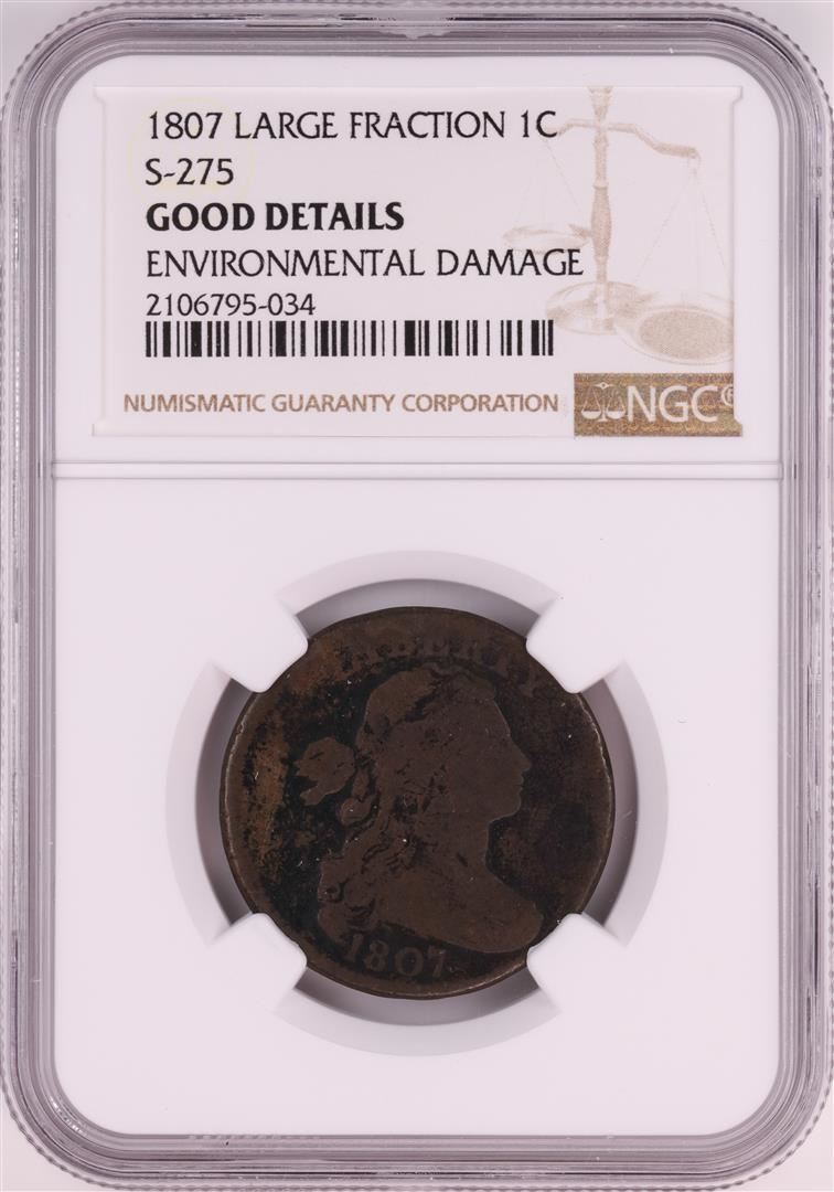 One 1807 Large Fraction S-275 Draped Bust Large Cent Coin NGC Good Details. NGC Certified.