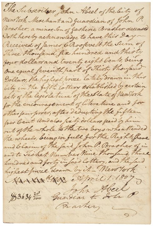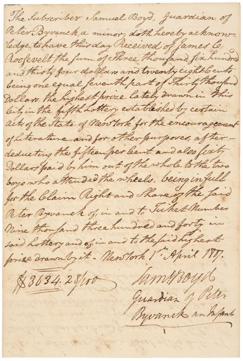 This original Document measures 5” x 7” is dated in 1807, and is a 1 page, double-sided, Lottery Claim for two minors who have apparently won one-seventh part of a $30,000 Literature Lottery prize. This totals a winning prize amount of $3634.28 after a 15% commission and $60 to pay two boys to spin the wheel. One winner is Peter Byvanck an infant, signed by Samuel Boyd as his Guardian and the other winner John Brasher, also a minor, signed by John Abeel as his Guardian. The entire text is very nicely written on period laid paper that is clean and easily readable, in deep brown ink. This is an extraordinary early American Lottery related document that is the first we have encountered in several decades to the instance of a prize is Won by an Infant Child and Claimed by His Guardian.