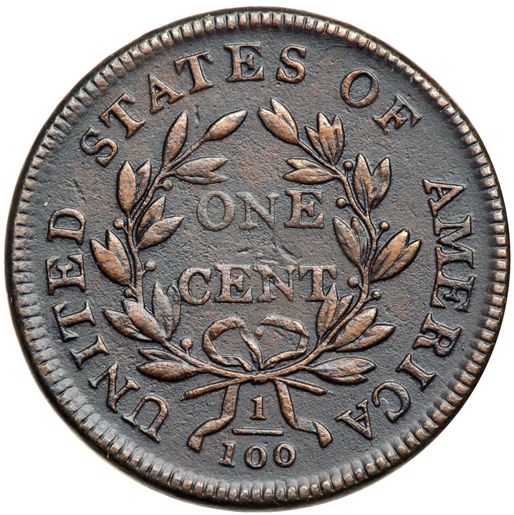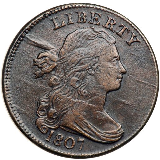 1807 S-271 R1 Comet Obverse VF20+. Sharpness VF35 with extremely fine porosity under an attractive chocolate brown patina. The highpoints are a slightly lighter shade of brown and this piece offers nice eye appeal in spite of the imperfect surfaces. No verdigris and only a few minor contact marks. The notable marks are a tiny pinprick between the feet of the R & T in LIBERTY and a light scratch hidden in the hair under that R. Both sides are covered with an extremely thin layer of lacquer or some similar protectant, but this is very difficult to detect. M-LDS, Breen state VI. The "Comet" break is bold as are the other linear die flaws on the obverse. An attractive example of this popular "Redbook" variety.