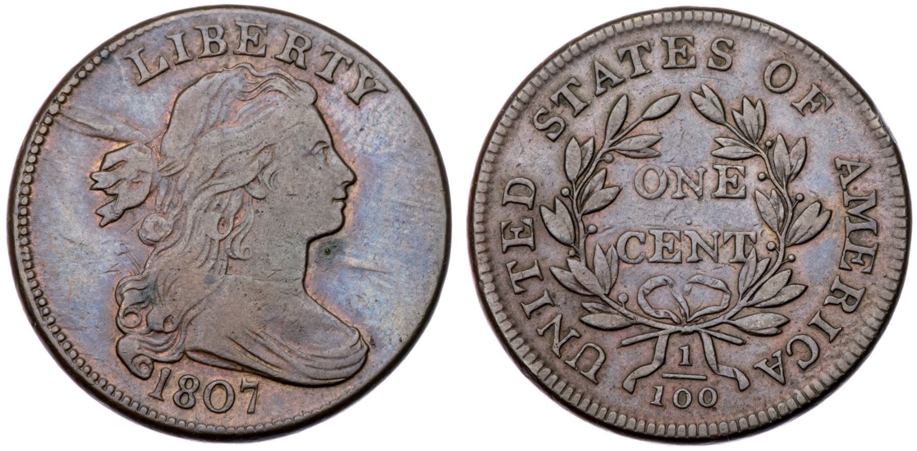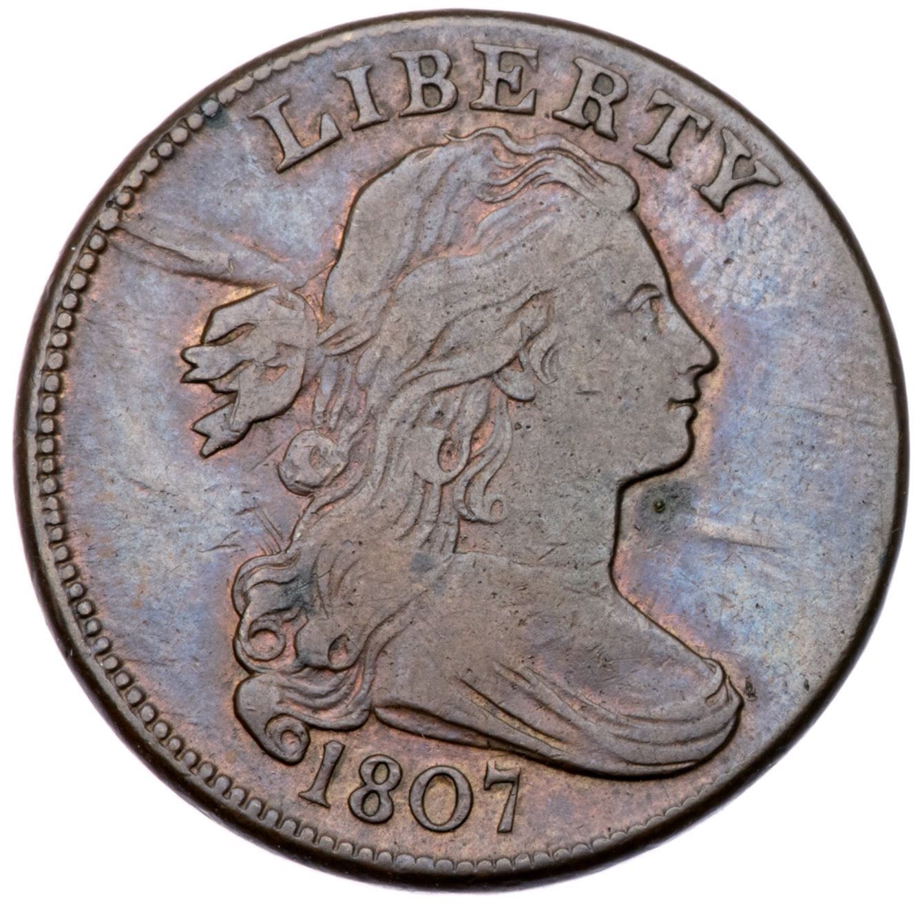 1807 S-271 R1 "Comet" Variety VF20Sharpness near VF30 but lightly cleaned and nicely retoned long ago. Glossy light to medium chocolate with traces of tan in protected areas. The surfaces are smooth and the only marks are a speck of carbon in the field under the jaw and another spot of carbon in the lower curls. M-LDS, Breen state VI, with a nicely formed Comet in the field behind the head in addition to the earlier linear die flaws in the fields. Graded VF30 net VF20 and tied for CC#25 in the Noyes census, his photo #29007. This is the Noyes plate coin for the later die state in his 1991 reference on the cents of 1793-1814.Certificate Number: Pedigree: Ex Hance Jaquett 6/1979-Fred H. Borcherdt Collection