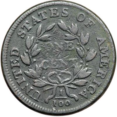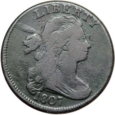1807 S-271 R1. VG-10. Comet Obverse. Slightly sharper but there is microscopic roughness under a slightly glossy dark olive and chocolate brown patina. The only notable marks are a small, thin scrape in the field before the eye and some light nicks inside the wreath. MDS. The "Comet" die flaw in the field behind the head is clear.