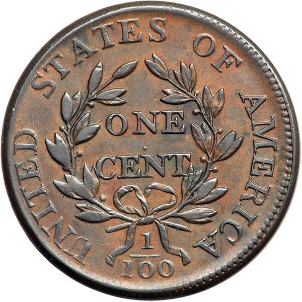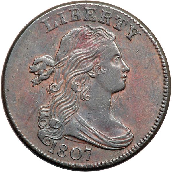 1807 S-275 R3 Large Fraction. VF-35. Five points sharper but there is a splash of reddish toning in the hair under the E in LIBERTY and a fine hairline scratch from the junction of the neck and bust to the lowest curl left of the date. Otherwise the planchet is smooth and attractive offering excellent eye appeal for the grade. Frosty steel and olive brown with lots of frosty lighter steel brown toning in protected areas, especially on the reverse. A very nice example of a variety that is difficult to locate in high grade. MDS, Breen state II, showing faint die clashmarks at ES-O. Struck slightly off center to K-9. Called EF40 and tied for CC#5 in the Breen/Bland census. Noyes says EF40 net VF25 and tied for CC#12, his photo #37370. Comes with an impressive provenance.
