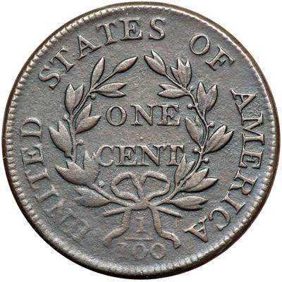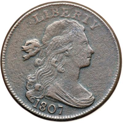 1807 S-276 R1. Fine-12. Large Fraction. Sharpness VF35 but uniform moderate granularity covers both sides. No marks or verdigris, essentially flawless except for the imperfect surfaces. Slightly glossy chocolate and steel. E-MDS, Breen state II. The reverse is rotated 20 degrees CCW.